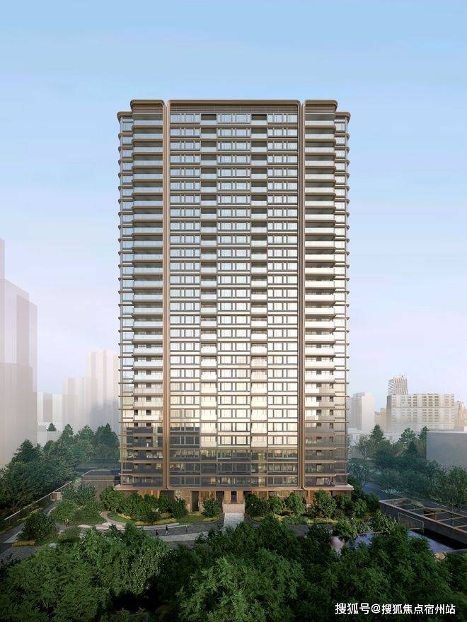 ①、高定级立面,一眼惊艳立面采用蓝灰色玻璃、仿铜色铝板、深色石材搭配,并用弧形倒角收边经管,耸立、通透又灵动,